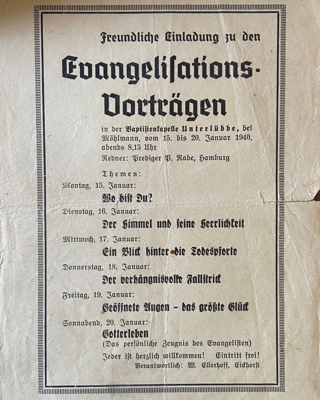 Der Landwirt Fritz Möhlmann war der Erste, der für sich die Bedeutung der Glaubenstaufe erkannte. Am 12. September 1926 ließ er sich in Bad Oeynhausen taufen – weitere Personen folgten, darunter Wilhelm Ellerhoff (22. Mai 1927), der später erster Gemeindeleiter wurde. Auch Fritz Woker und Fritz Oestreich gehörten zu den frühen Glaubensgeschwistern.